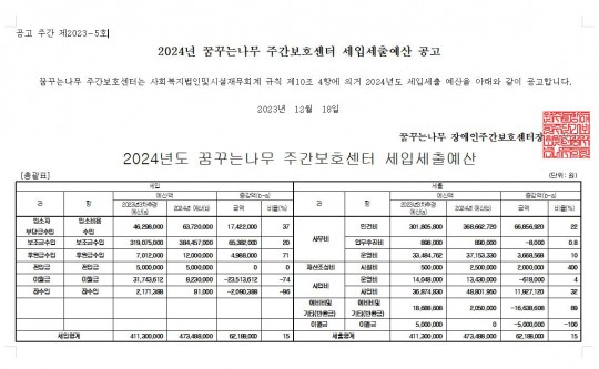 꿈꾸는나무 주간보호센터 2024년 세입세출 예산 공고
