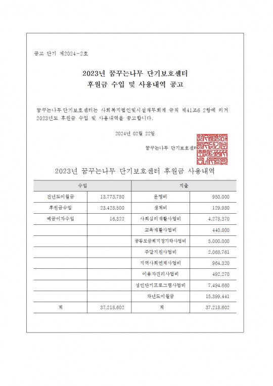 꿈꾸는나무 단기보호센터 2023년 후원금수입 및 사용내역 공고
