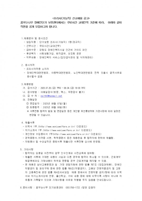 2023년 꿈꾸는나무 단기보호센터 기능직(조리원)(1명) 채용연장 5차 재공고