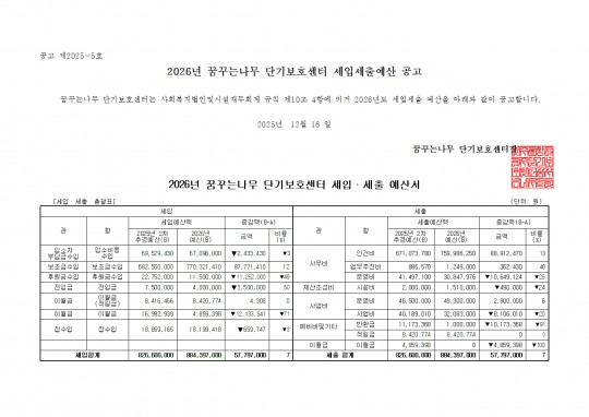 꿈꾸는나무 단기보호센터 2026년 세입세출 예산공고