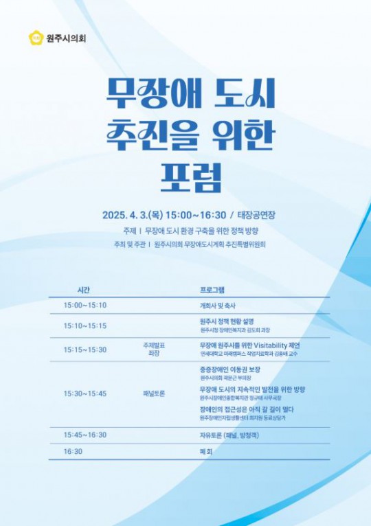 □ 행사개요 - 행 사 명: 「무장애 도시 추진을 위한 포럼」 - 행사일시: 2025. 4. 3.(목) 15:00~17:00 - 행사장소: 태장공연장(강원 원주시 치악로 2068-6) - 주 제: 무장애 도시 환경 구축을 위한 정책 방향 많은 관심과 참여 부탁드립니다 ^^