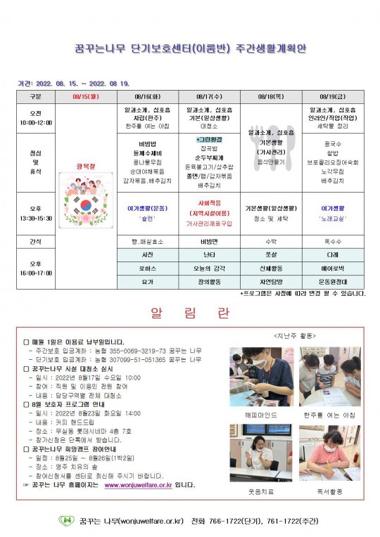 이룸반 주간계획안 (2022년 08월15일~08월19일)