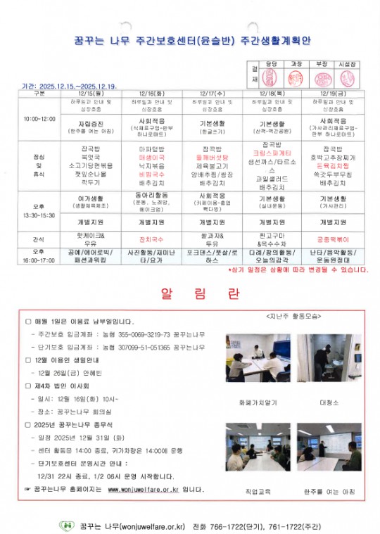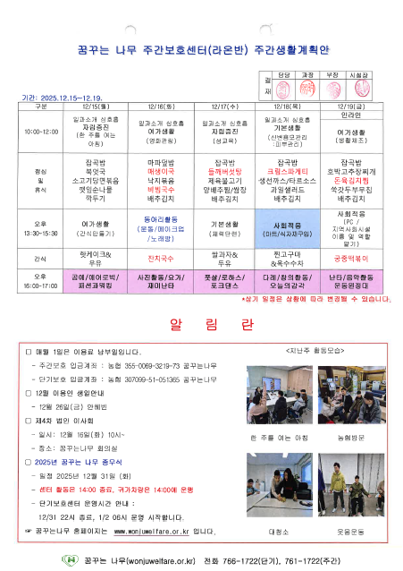 찬솔, 윤슬, 하랑, 라온 주간계획안입니다(2025.12.15~2025.12.19)