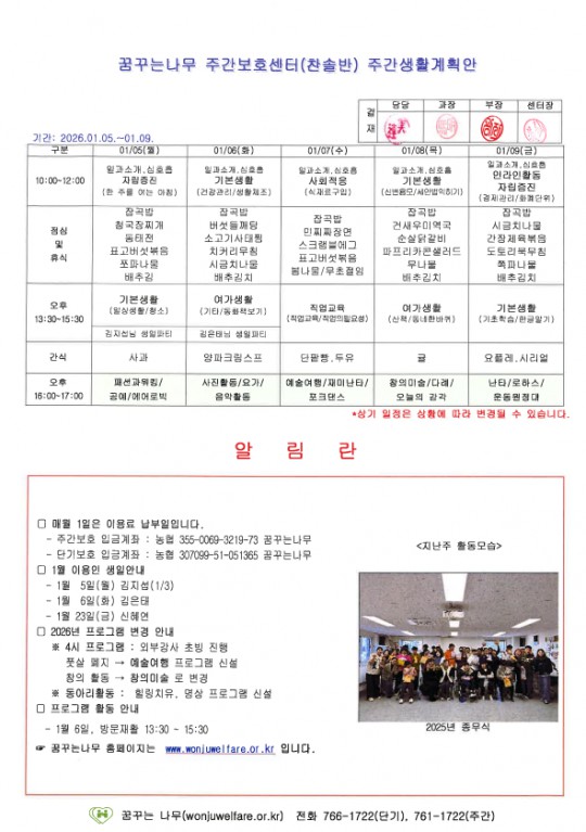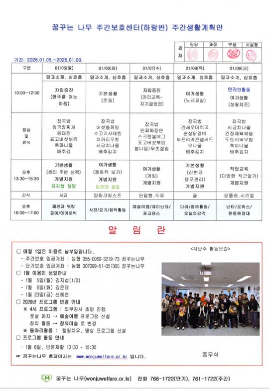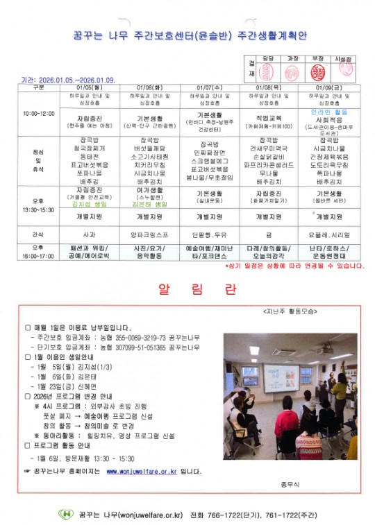 라온,윤슬,찬솔,하랑 주간계획안(2026.01.05~2026.01.09)