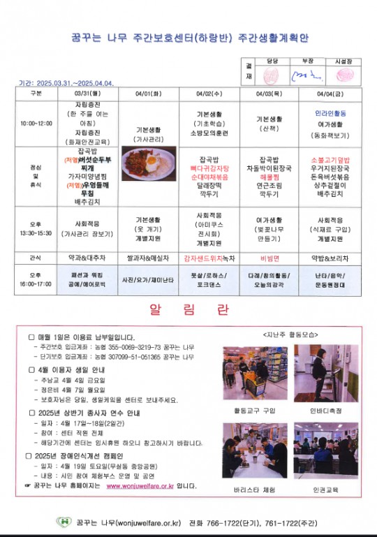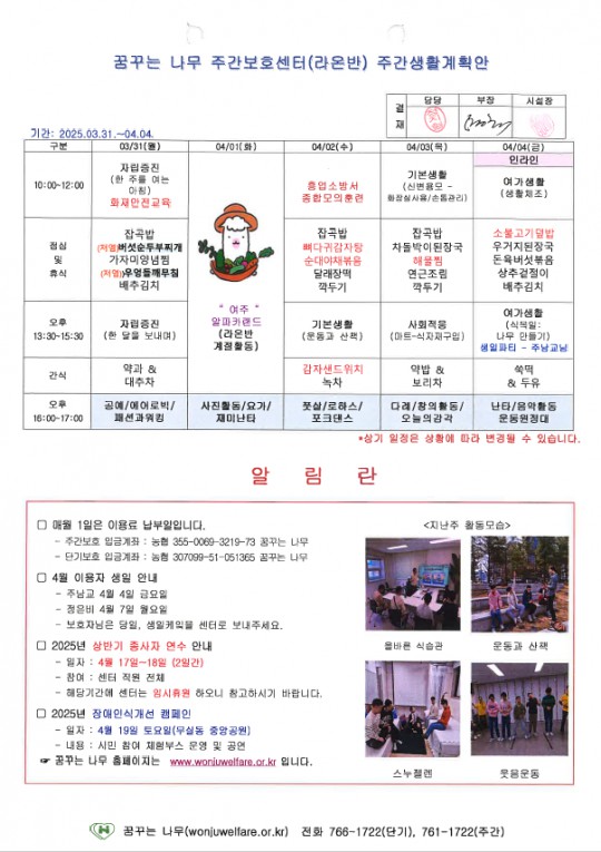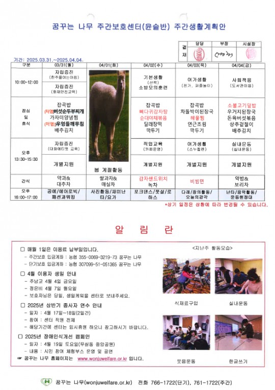 라온반, 찬솔반, 윤슬반, 하랑반 주간계획안(2025.03.31~2025.04.04)