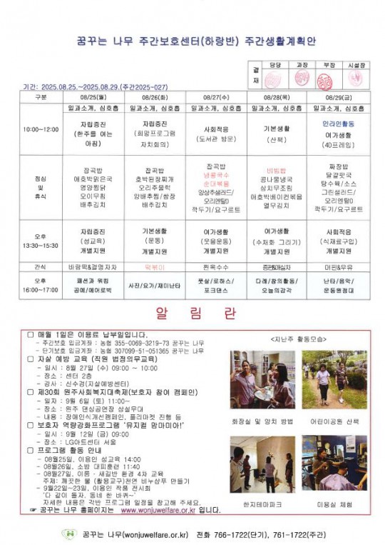 라온반, 찬솔반, 윤슬반, 하랑반 주간계획안(2025.08.25~2025.08.29)
