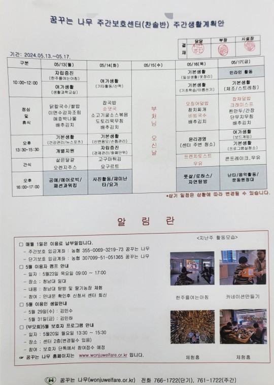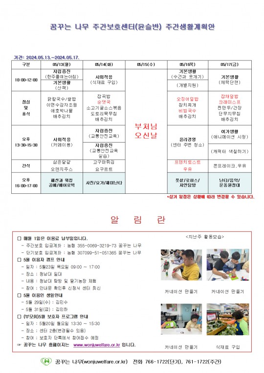 2024.05.13 ~ 05.17 주간보호 주간계획안입니다.