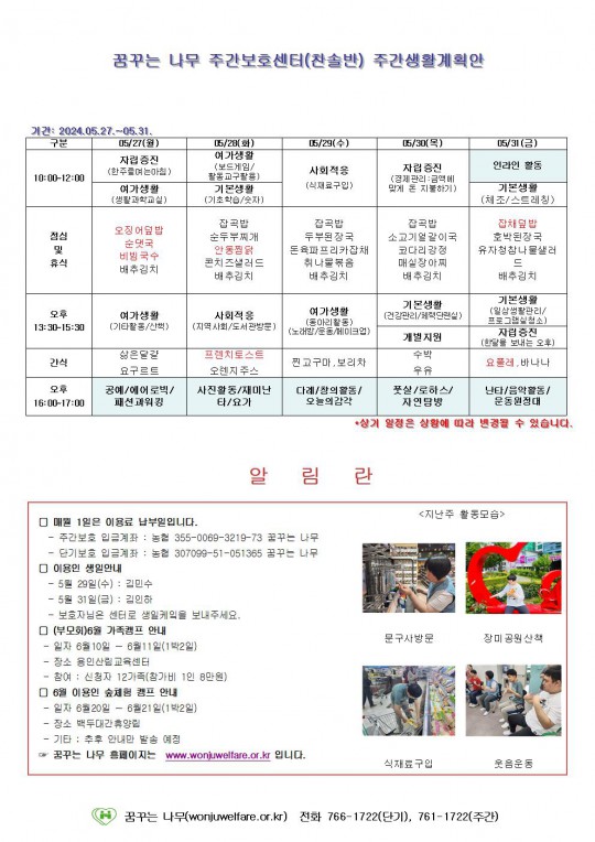 2024.05.27 ~ 2024.05.31 주간보호 주간계획안입니다.