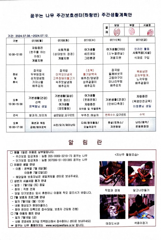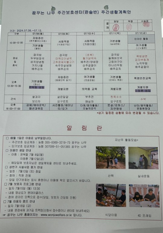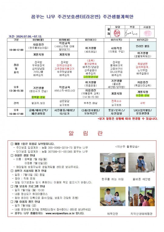 2024.07.08 ~ 2024.07.12 주간보호 주간계획안입니다.