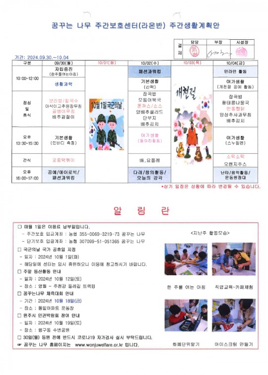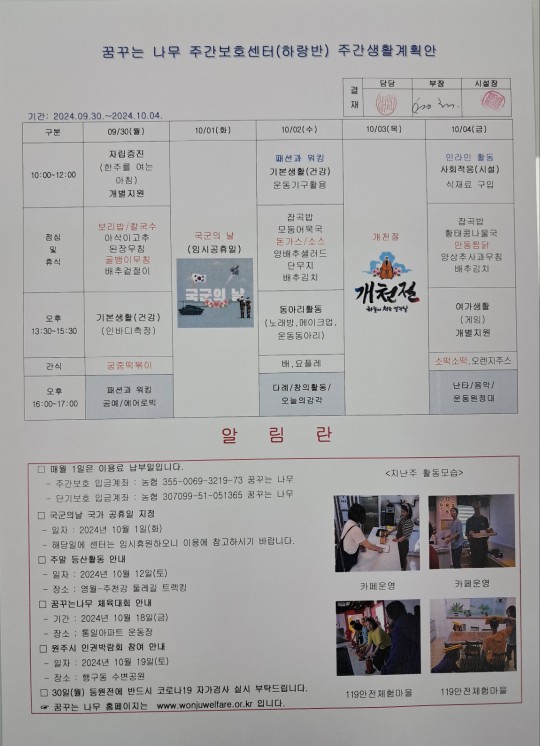 2024.09.30~10.04 주간보호 주간계획안입니다.