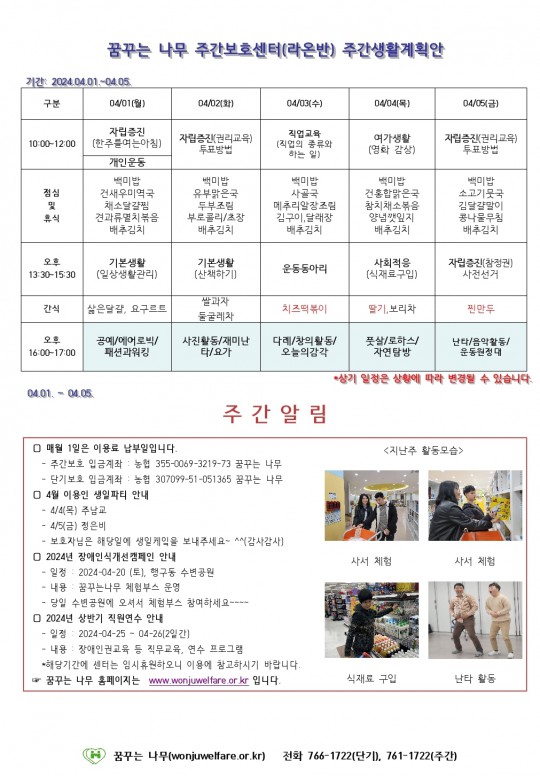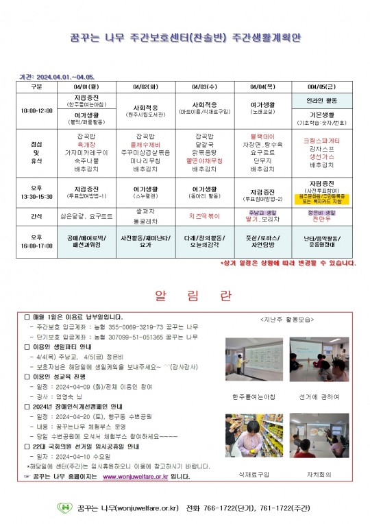 2024.04.01(월) ~ 04.05(금) 주간보호 주간계획안입니다.