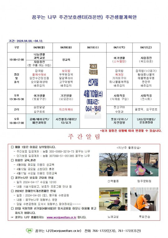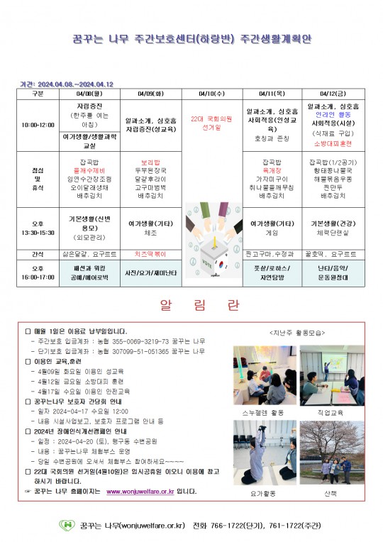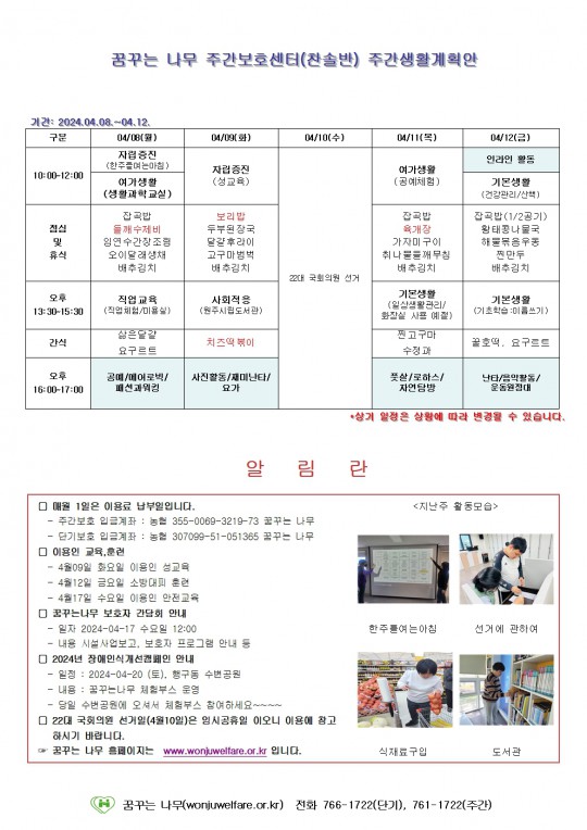2024.04.08 ~ 2024.04.12 주간보호 주간계획안입니다.
