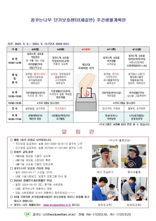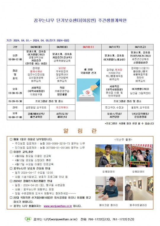 2024.04.08 ~ 2024.04.12 단기보호 주간계획안입니다.