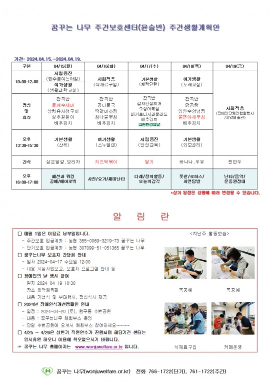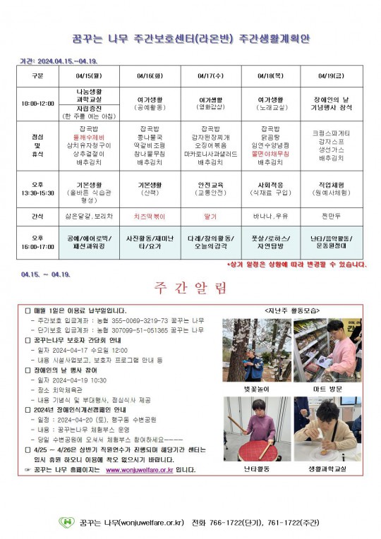2024.04.15 ~ 04.19 주간보호 주간계획안입니다.