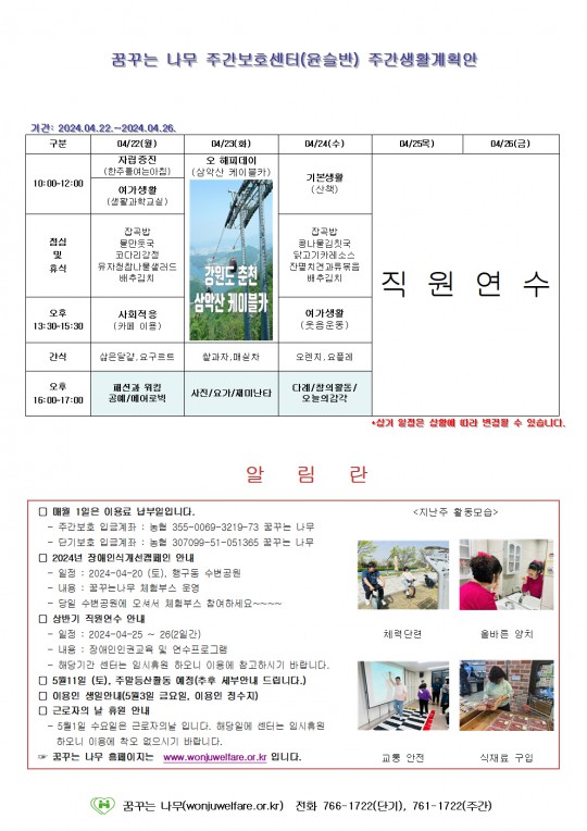 2024.04.22 ~ 2024.04.26 주간보호 주간계획안입니다.