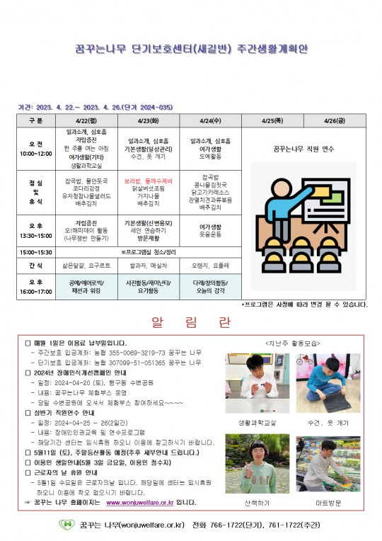 2024.04.22 ~ 2024.04.26 단기보호 주간계획안입니다.
