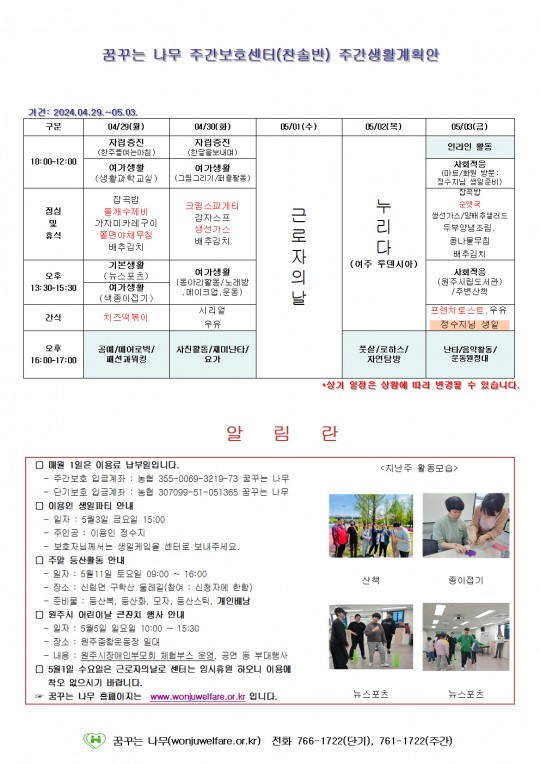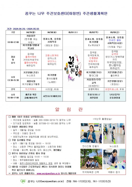 2024.04.29 ~ 2024.05.03 주간보호 주간계획안입니다.