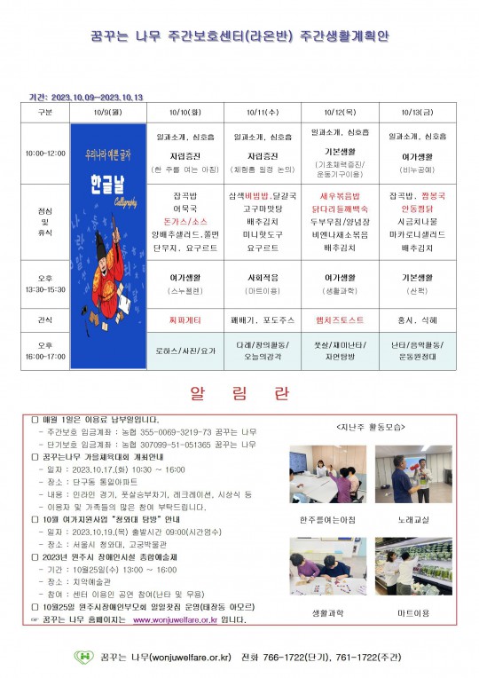 주간계획안(하랑/윤슬/찬솔/라온) 2023.10.09~