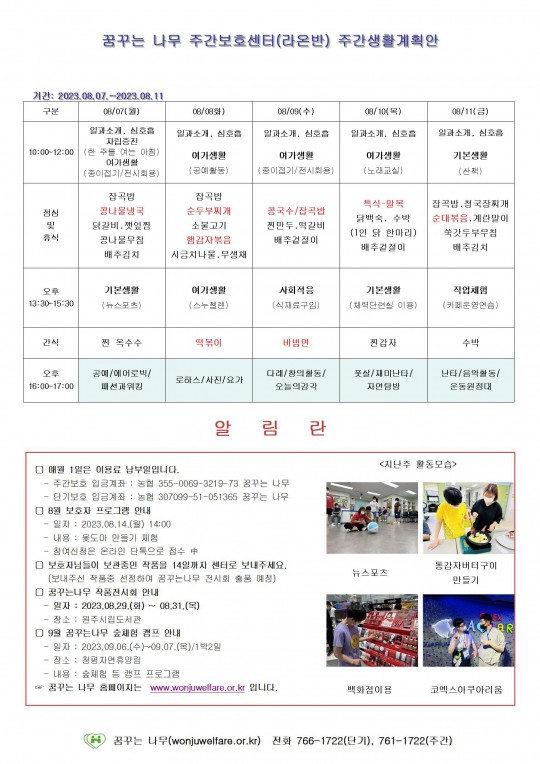 주간계획안(하랑/윤슬/찬솔/라온) 2023.08.07~