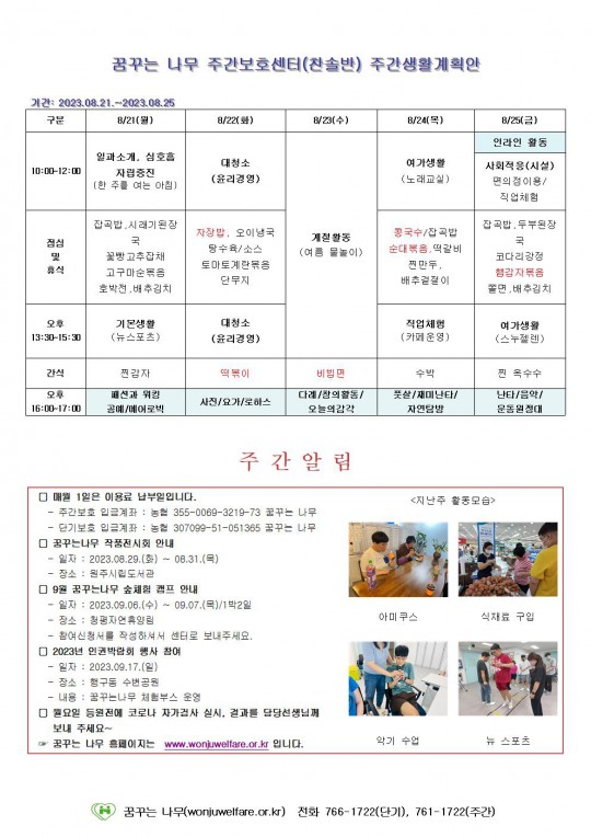 주간계획안(하랑/윤슬/찬솔/라온) 2023.08.21~