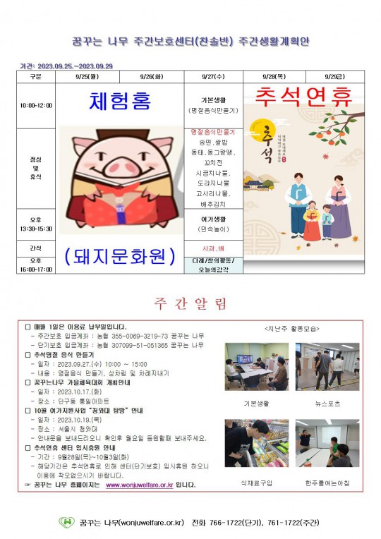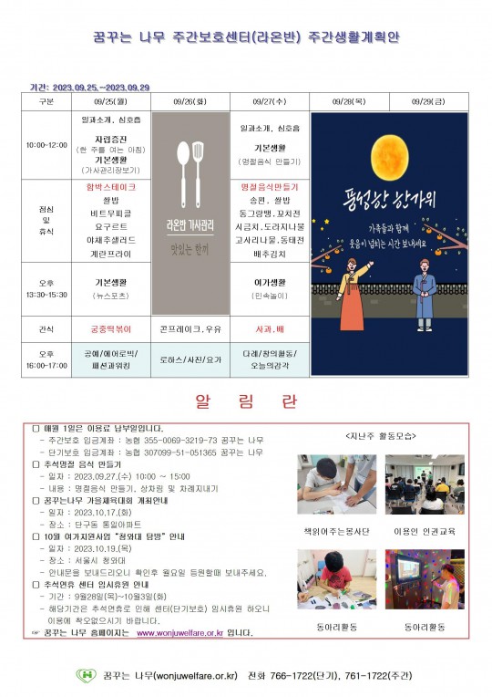 주간계획안(하랑/윤슬/찬솔/라온) 2023.09.25~