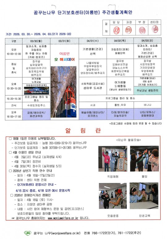 이룸반, 새길반 주간계획안(2026.03.30~04.03)